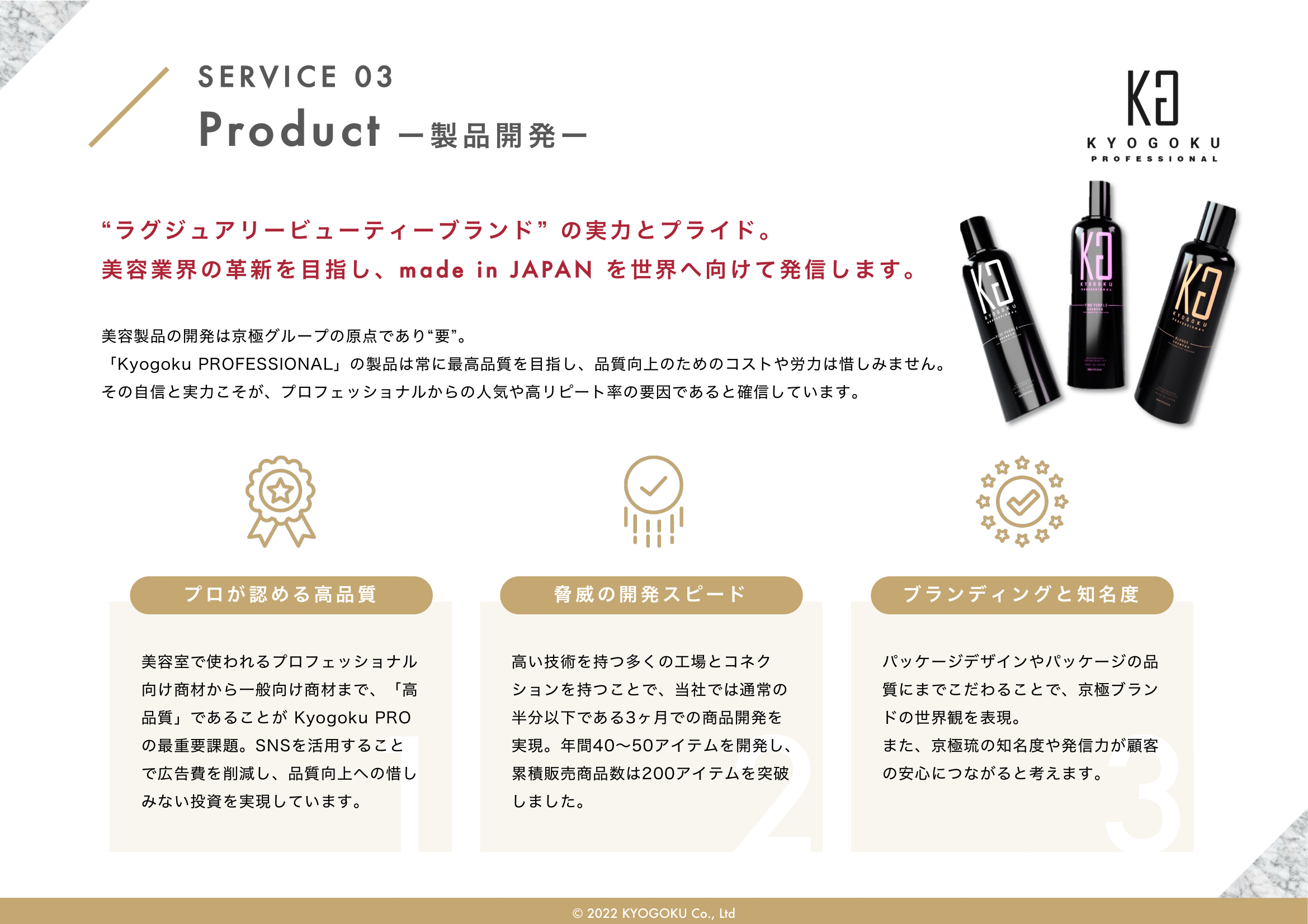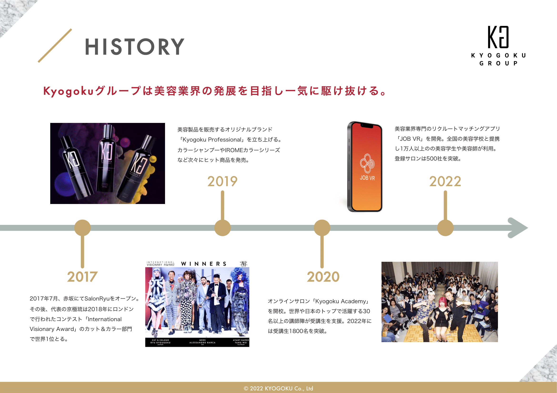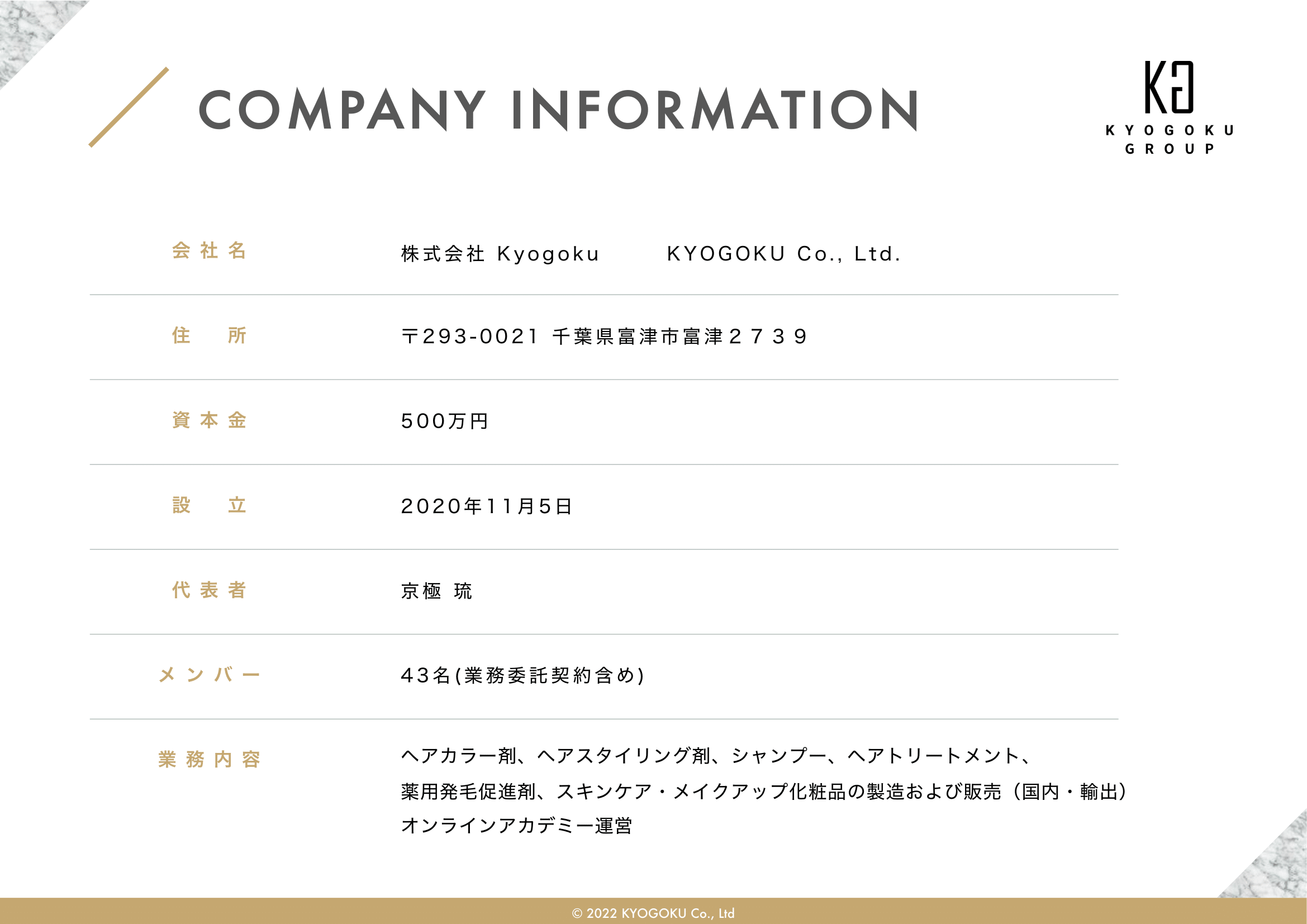 会社概要 会社概要2022年 PDF 社名 株式会社Kyogoku 法人番号 6030001151222 所在地 〒340-0034 埼玉県草加市氷川町2152番地1 設立 2020年11月5日 資本金 500万円 代表者 田中美穂 従業員数 43名(業務委託契約含め) 事業概要 ヘアカラー剤、ヘアスタイリング剤、シャンプー、ヘアトリートメント、 薬用発毛促進剤、スキンケア・メイクアップ化粧品の製造および販売(国内・輸出) オンラインアカデミー運営