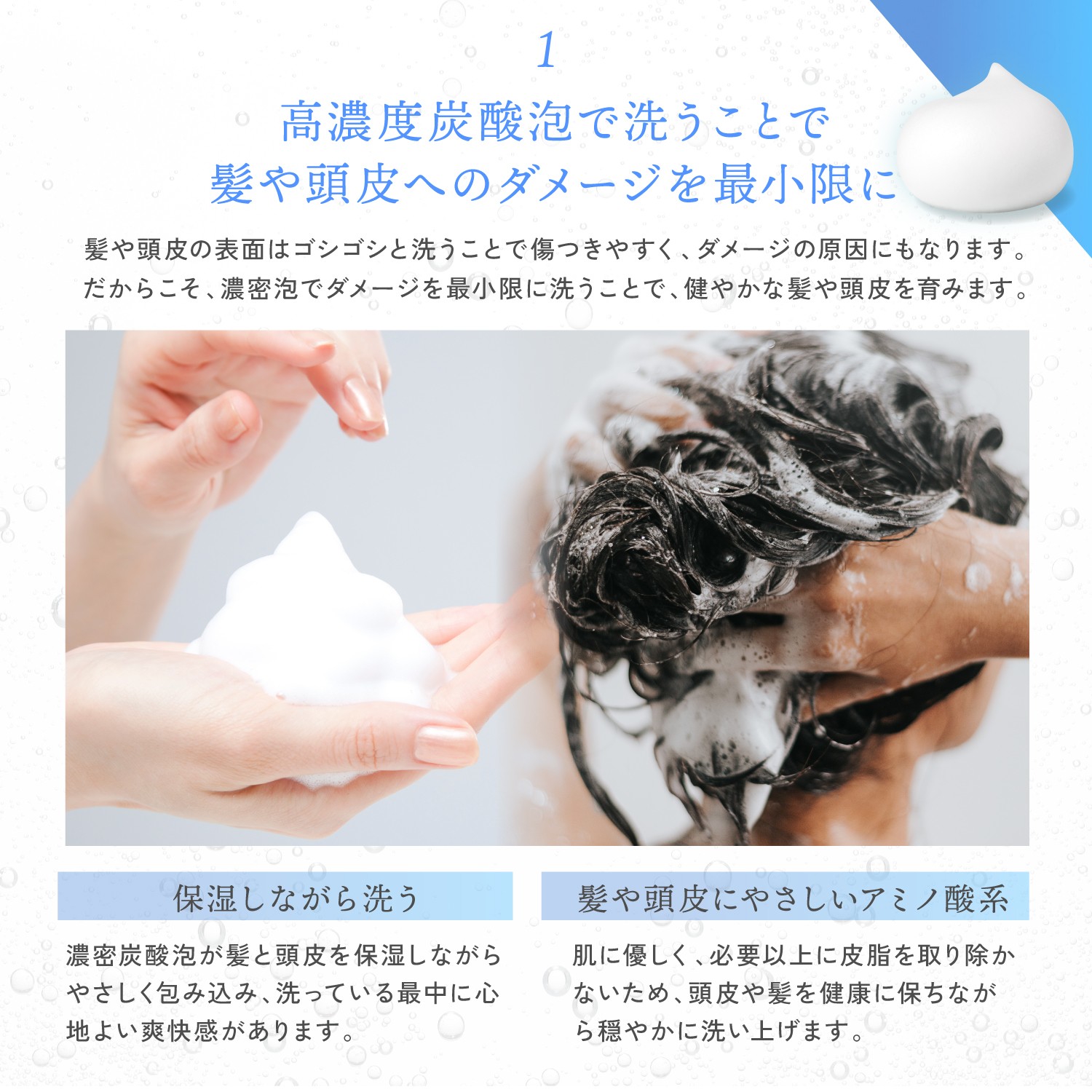 - さらに、アミノ酸系洗浄成分と植物性保湿成分を配合し、髪と頭皮をやさしく洗い上げながら、潤いをキープ。泡状で出るため摩擦を最小限に抑え、敏感な頭皮やブリーチ後のダメージ頭皮にも対応。