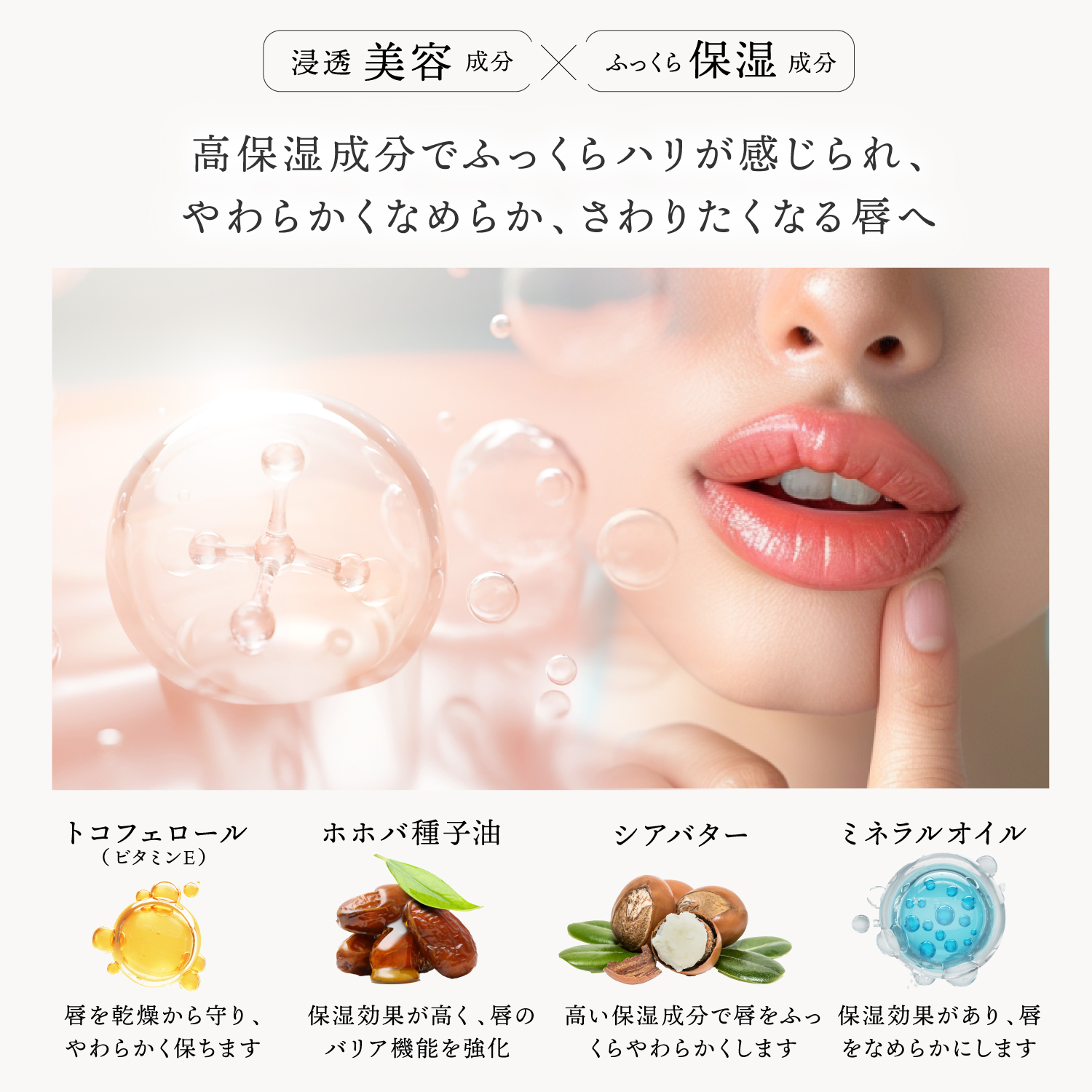 - ヒアルロン酸Naとスクワランが唇の奥まで潤いを届け、乾燥・縦ジワをケア