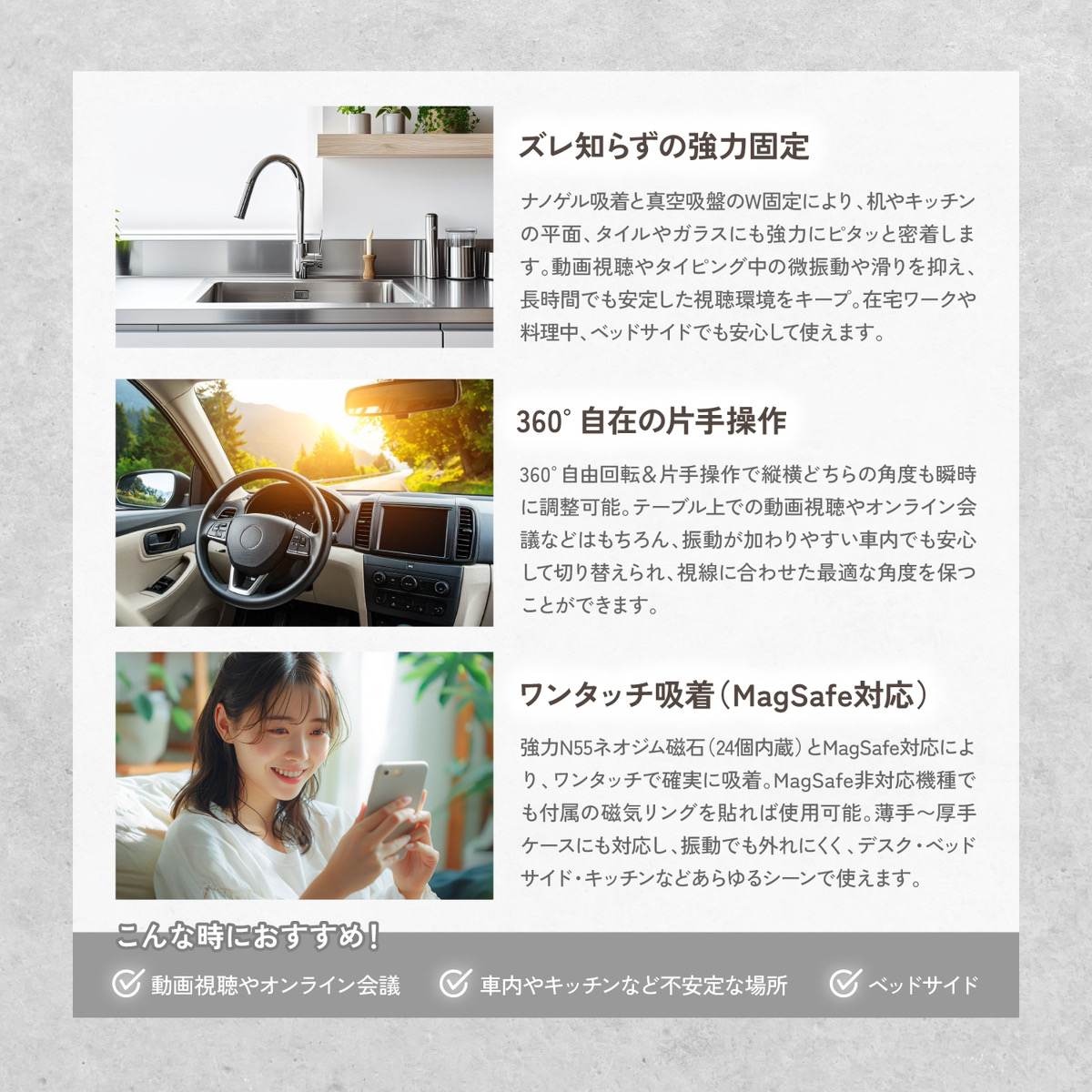 このスタンドは、車用のカーユニットとして使用できます。片手で操作し、360度回転するため、様々な角度で鑑賞できます。ナノゲル吸着×真空吸盤のW固定構造は、安定した固定を確保します。magsafeに対応し、N60磁石を使用しています。